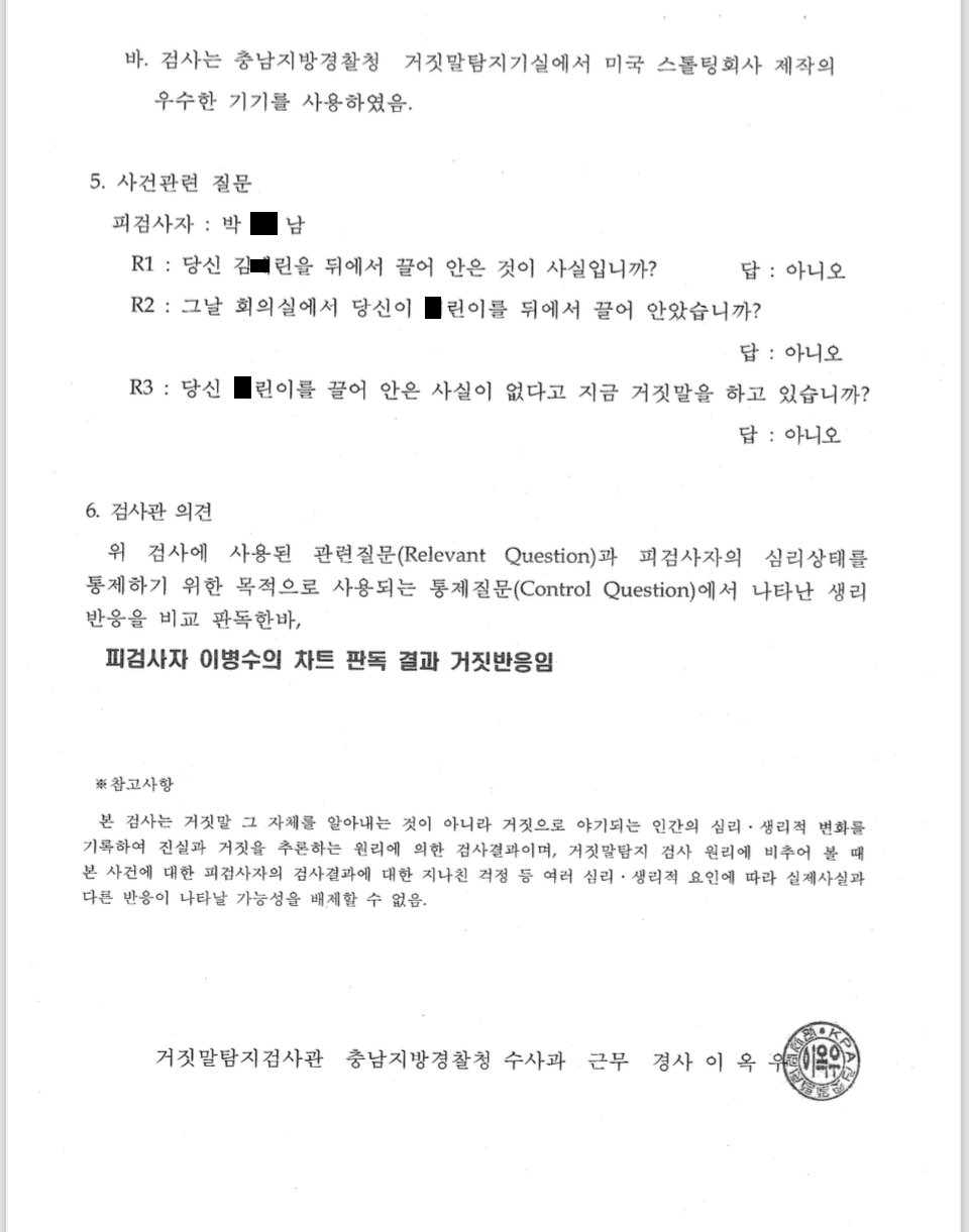 (1) 2010.6.28일 충남 경찰청 회시(신)에 의하면, 서두에 '피조사자 박O남의 차트 판독 결과 거짓 반응임' 기재하고는