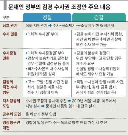 경찰이 모든 사건에 대해 1차 수사권을 갖고 검사의 수사지휘를 받지 않도록 했다. 다만 수사가 미흡하다고 판단되면 검찰은 보완 수사를 요구할 수 있다고 정했다. 한일 양국 검찰은 경찰 수사를 지휘할 뿐 보완수사를 요구하지 않는다. 반면 중국은 수사지휘 대신 필요시 보완수사를 요청하는 방식이다.