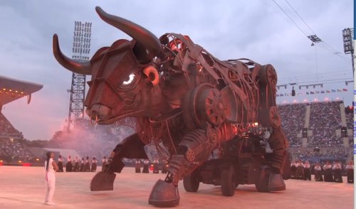 거대한 소 조형물이 등장하고 사람들이 엄숙하게 영접한다