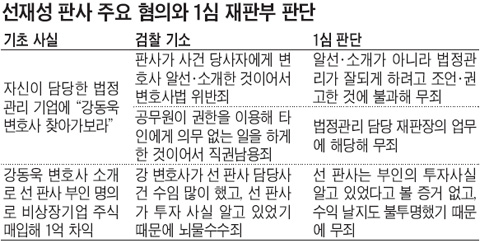 선재성이 2005년 강 변호사 소개로 부인을 통해 비상장 주식에 투자, 시세차익 1억여원을 거둔 혐의(뇌물수수)에 대해서도 "선재성이 애초 투자 사실을 알았다는 증거가 없고, 시세차익을 볼 것을 예상하지 못했다"며 무죄 선고했다. 뇌물공여 등 혐의로 기소된 강동욱 변호사에게도 무죄 선고했다.