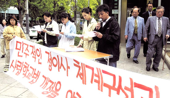 사진/ 사학분규의 직접적인 원인은 비리재단이지만 분규 해결의 ‘걸림돌’로는 교육부가 파견하는 임시이사가 지목된다. 지난 10월13일 임시 이사가 파견된 한 대학의 학생들이 민주적인 정이사 체제를 요구하는 기자회견을 열고 있다.(한겨레 김경호)