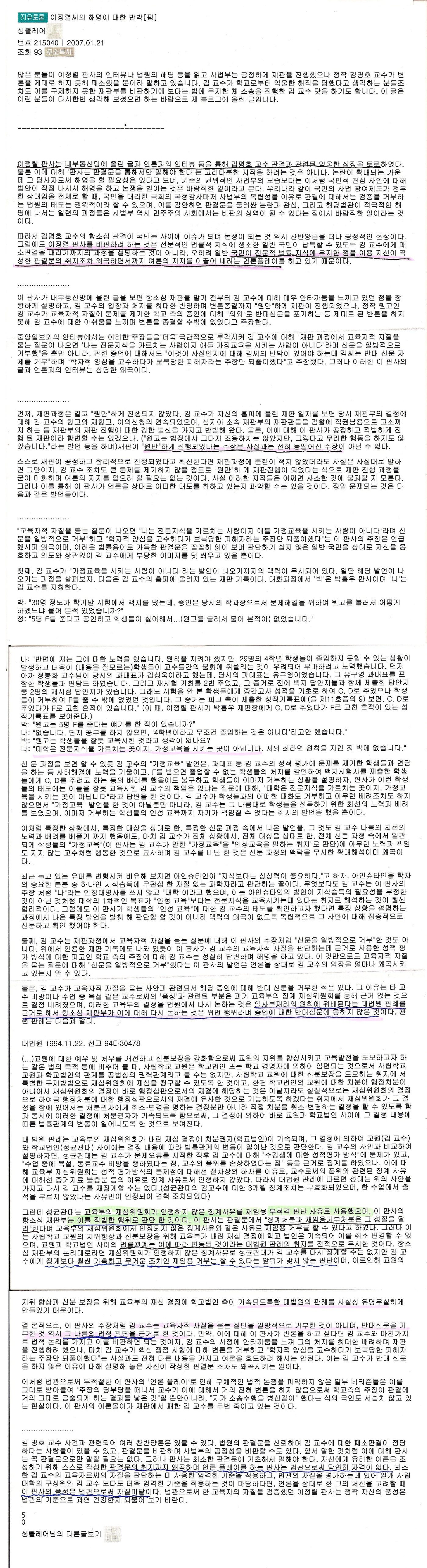 때문에..... 다만 들려오는 여러가지 이야기들에 의하면 김명호 교수가 그렇게 (교육자로서) 나쁜 자질을 갖는 교수는 아니었던 것으로 보인다. 자신의 소신을 밀어붙이는 뚝심있는 사람이었으며, 김명호 교수의 소신이 옳으면 옳았지 틀린 소신은 아닌 것같다.
