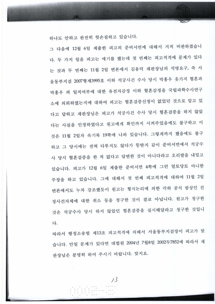 박홍우 피가 아닌 제 3자의 피로 증거조작하였기에 박홍우 옷가지와 박홍우 피의 일치 여부에 대한 유전자 감정을 고의적으로 하지 아니하였다. 증거 조작한 검찰 놈들과(백재명, 조주태 검사) 혈흔 일치 여부 검증도 없이 증거채택하여 유죄 판결 내린 법원의 재판테러범들이(김용호, 이회기, 신태길, 이홍훈, 김홍도, 노정희, 김용덕 판사등의 쓰레기들 집단들) 혈흔 검증하지 않으려고 발버둥 치고 있다. |